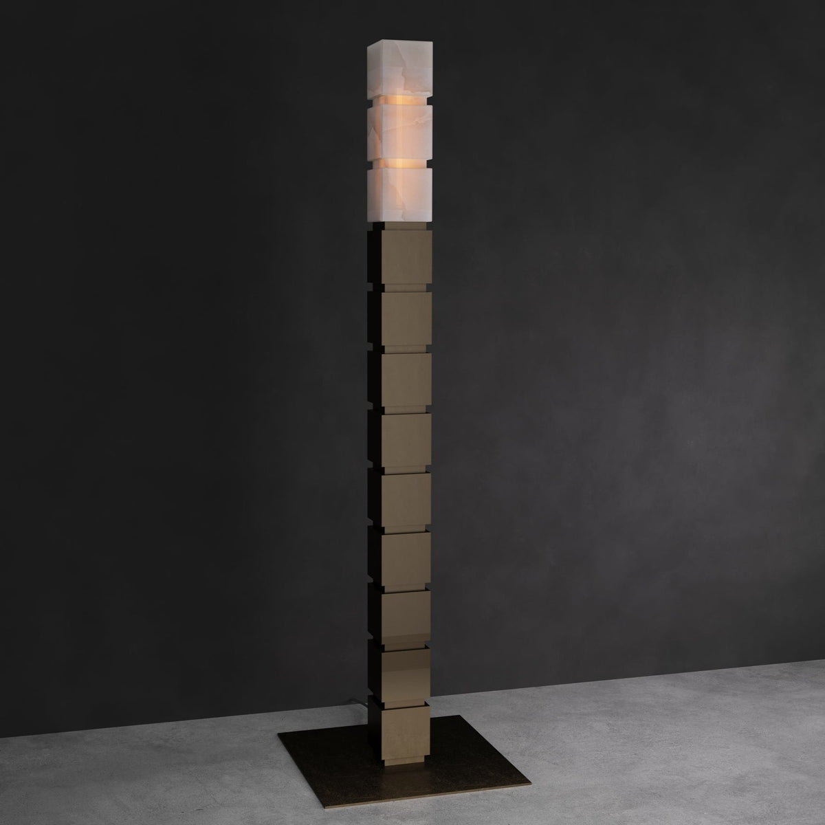 A totem of carved natural alabaster atop solid cast oil rubbed bronze torchiere.