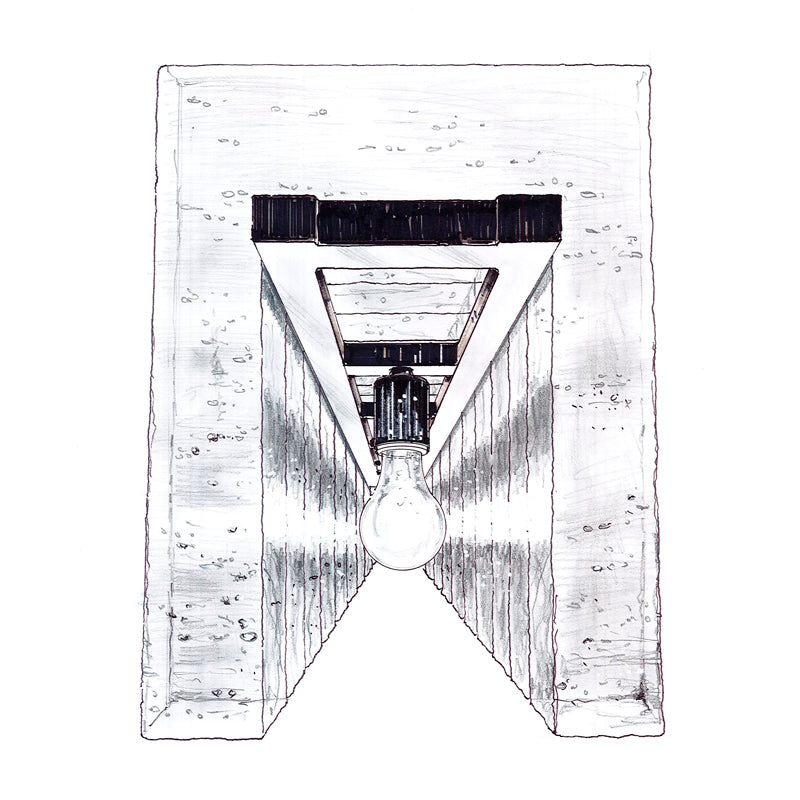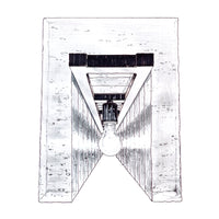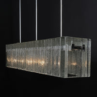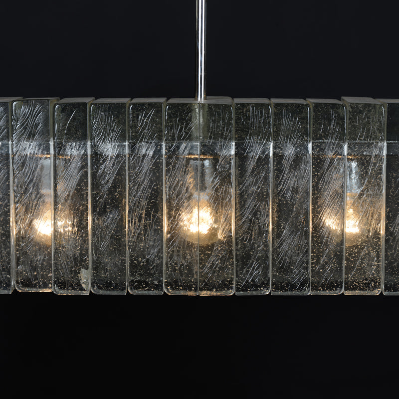 A careful colonnade of 2” thick sand cast seeded glass spans a refined frame of mirrored stainless steel.