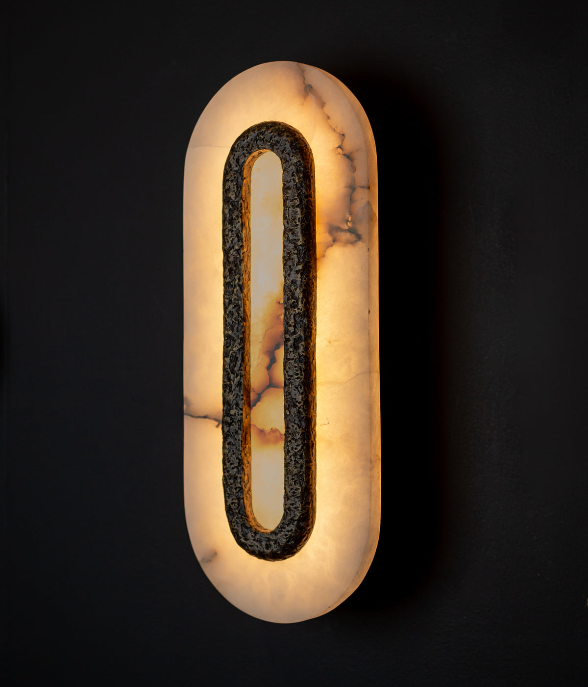 An architecturally-inspired duet of dramatic veined alabaster with a textured cast bronze – a trio of simply striking silhouettes.