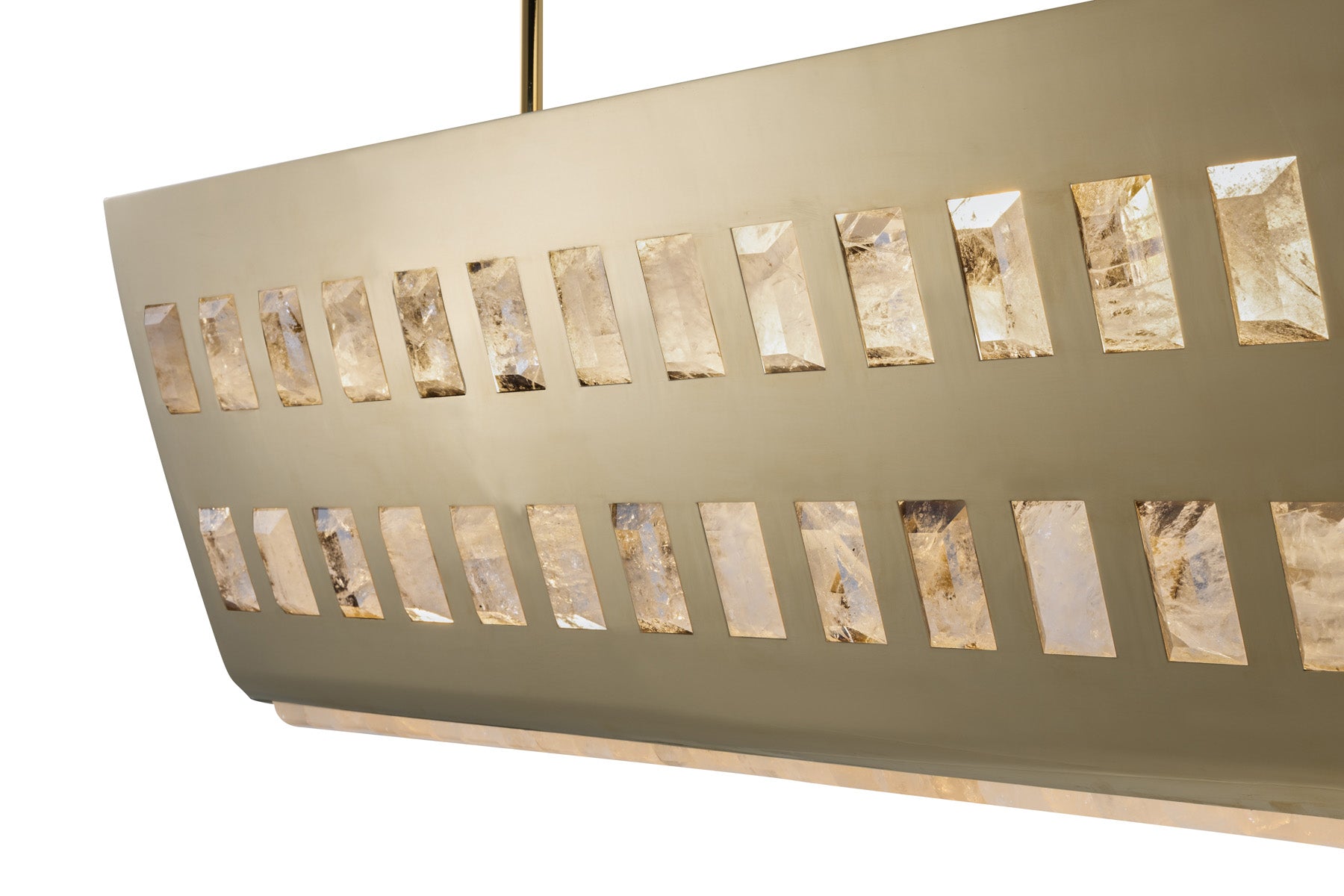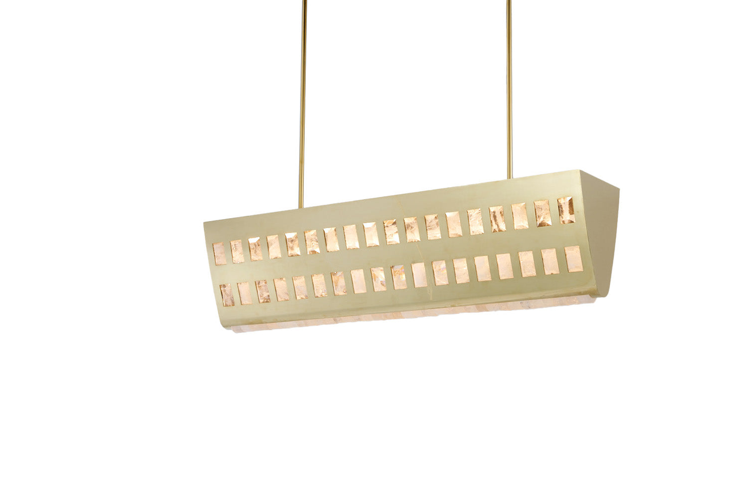Inspired by Modernist architectural lines and silhouettes –natural quartz rock crystal cabochons glow in a 3 – sided or conical frames of polished brass.