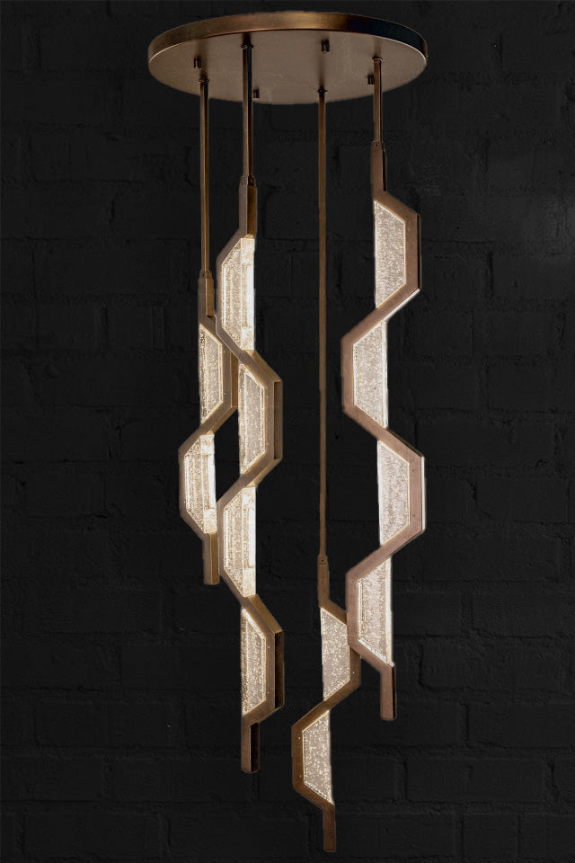 Capturing the spirit of ancient motifs and artisanal craft fused with contemporary inspiration, the ZIGGY collection features angled bronze silhouettes with glowing canted lenses of sand-cast textured and seeded glass.
