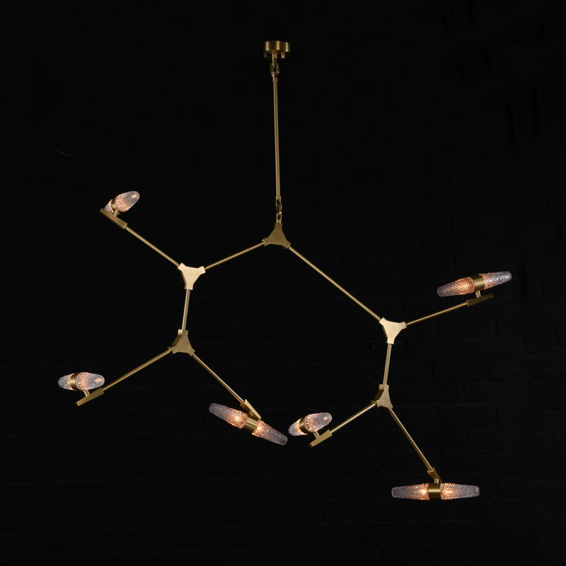 Doubled spiked double glass cones in the ancient Rostrato style sparkle on modern arms of bold brushed brass connected by delicately engineered knuckles.